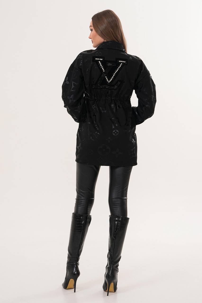 Modern desen dokusu ve zarif taş aplikesiyle öne çıkan bu siyah ceket şık ve güçlü bir duruş sunar