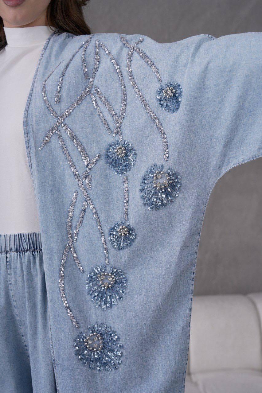 Taş aplikeli çiçek işlemeleriyle dikkat çeken Mavi Kot Kimono Takım, modern şıklığı zarif detaylarla buluşturuyor. Açık mavi kot dokusu üzerine işlenen taş detaylar takı etkisi yaratırken, rahat kesimi gün boyu konfor sunar. Kimono formu sayesinde vücuda yapışmadan dökümlü bir duruş sağlar. Günlük kombinlerden özel davetlere kadar farklı ortamlarda rahatlıkla tercih edebileceğiniz şık ve iddialı bir takımdır.