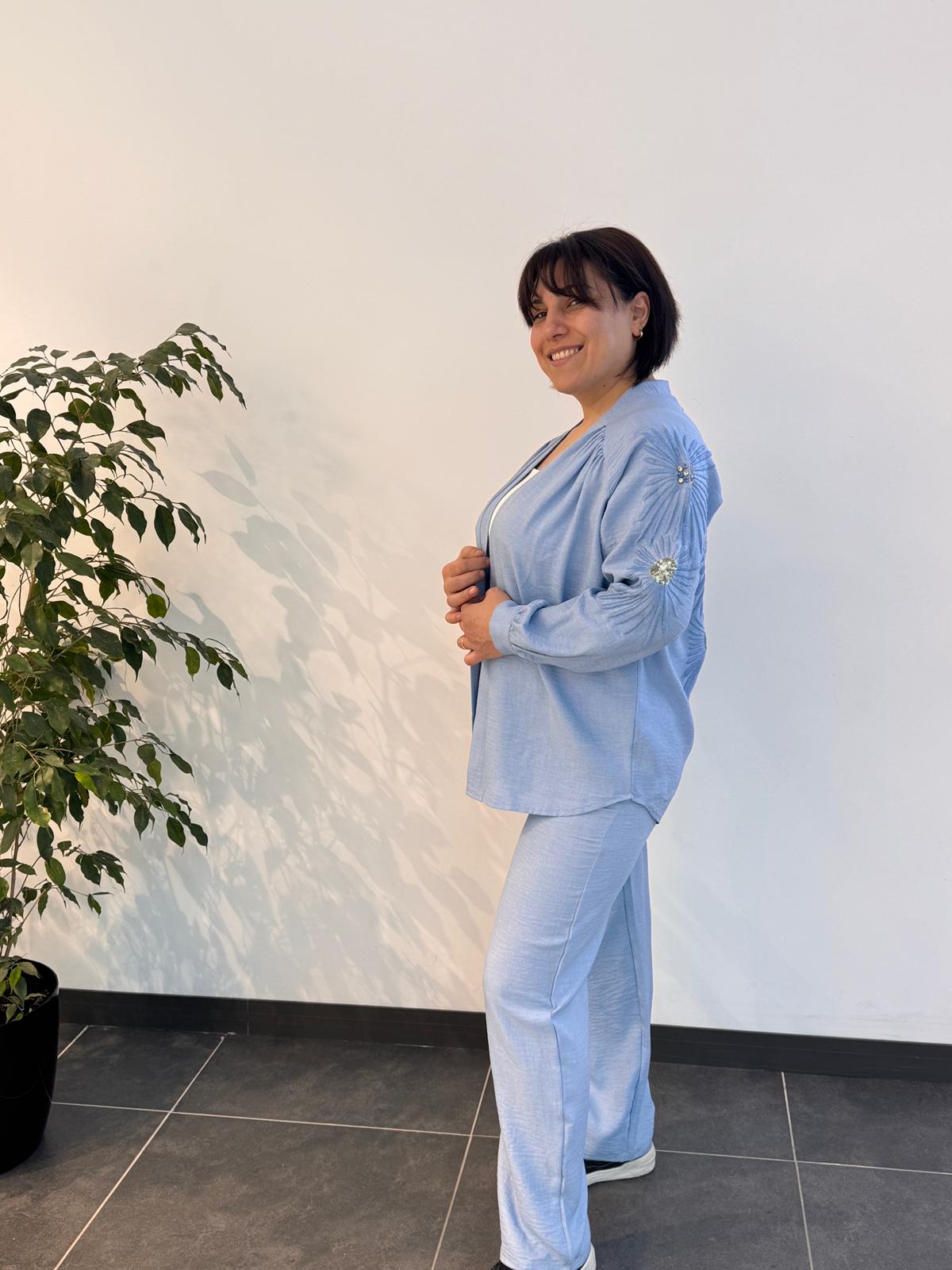 Zarif detaylarıyla öne çıkan Taş Aplikeli Omuz Büzgülü Bebe Mavi Takım, gün boyu konforu şıklıkla buluşturur
