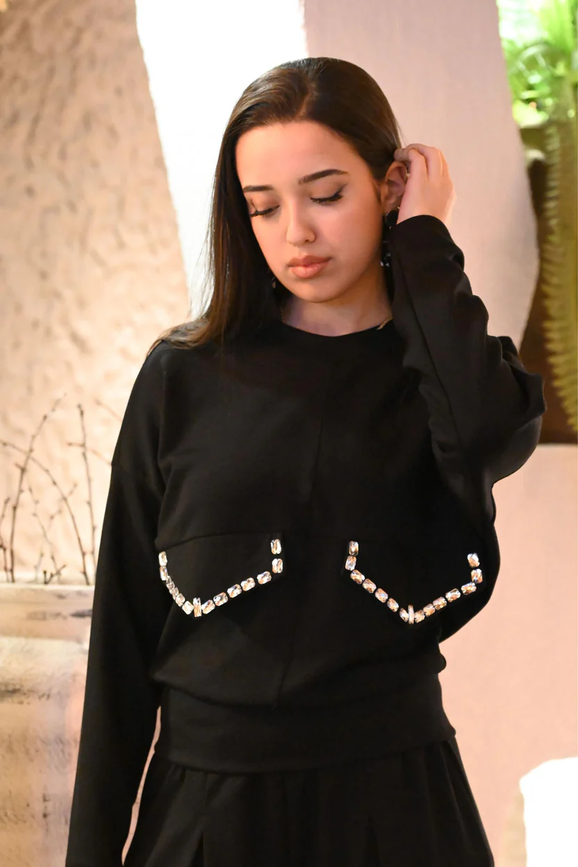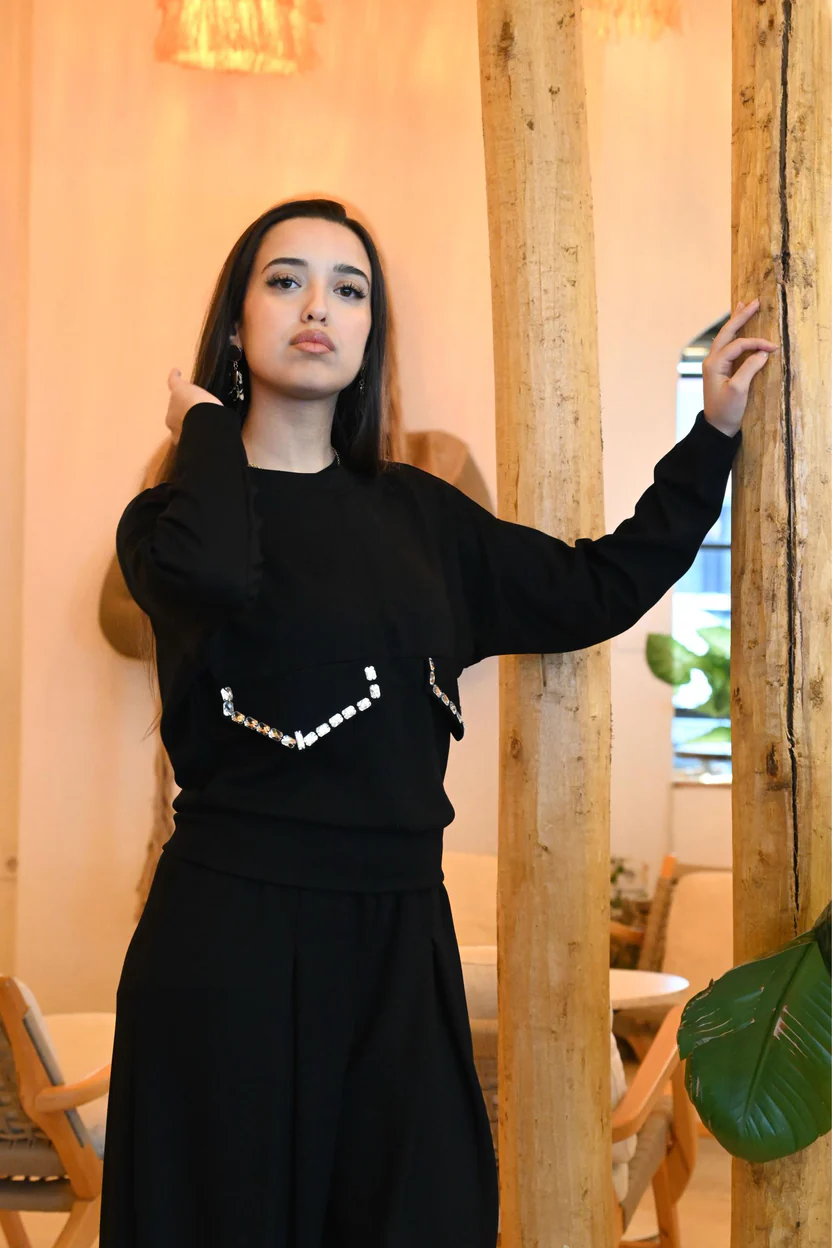 Taş detaylarıyla hareket kazanan sweat modeli, rahat kalıbı ve modern duruşuyla günlük kombinlere ışıltılı bir dokunuş katar. Dikkat çekici bir stil isteyenler için ideal bir takımdır.