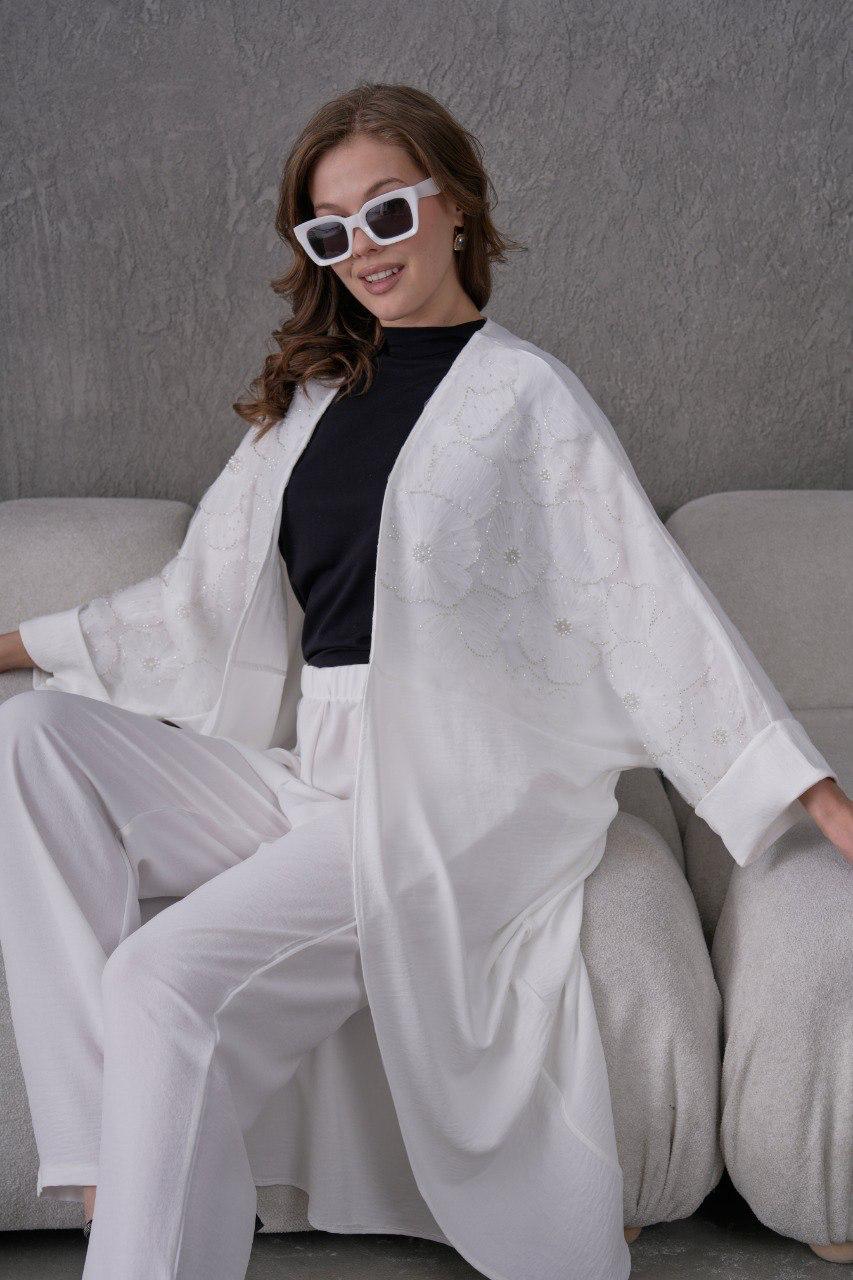 Zarif yarım çiçek dokusu ve ince taş detaylarıyla öne çıkan bu beyaz kimono takım ferah ve şık bir stil sunar