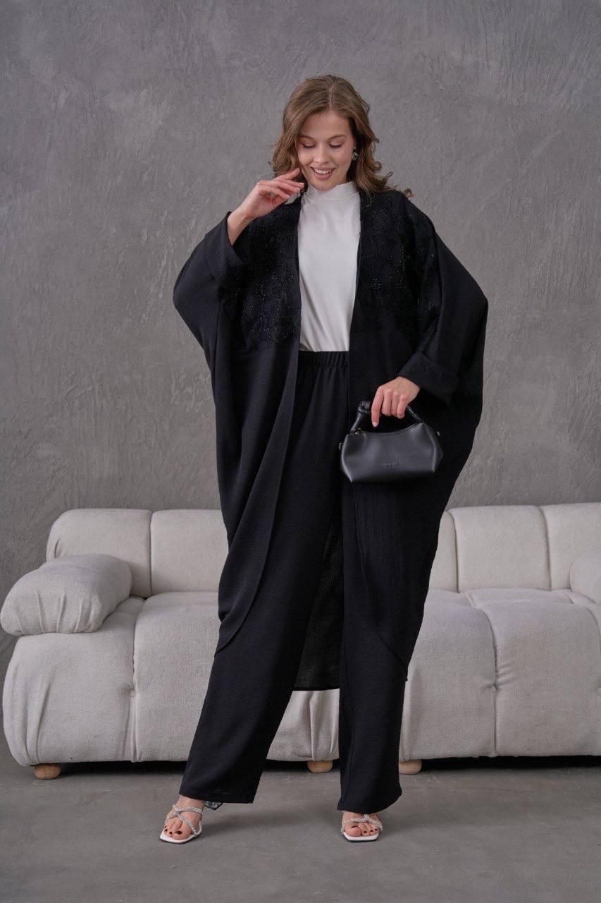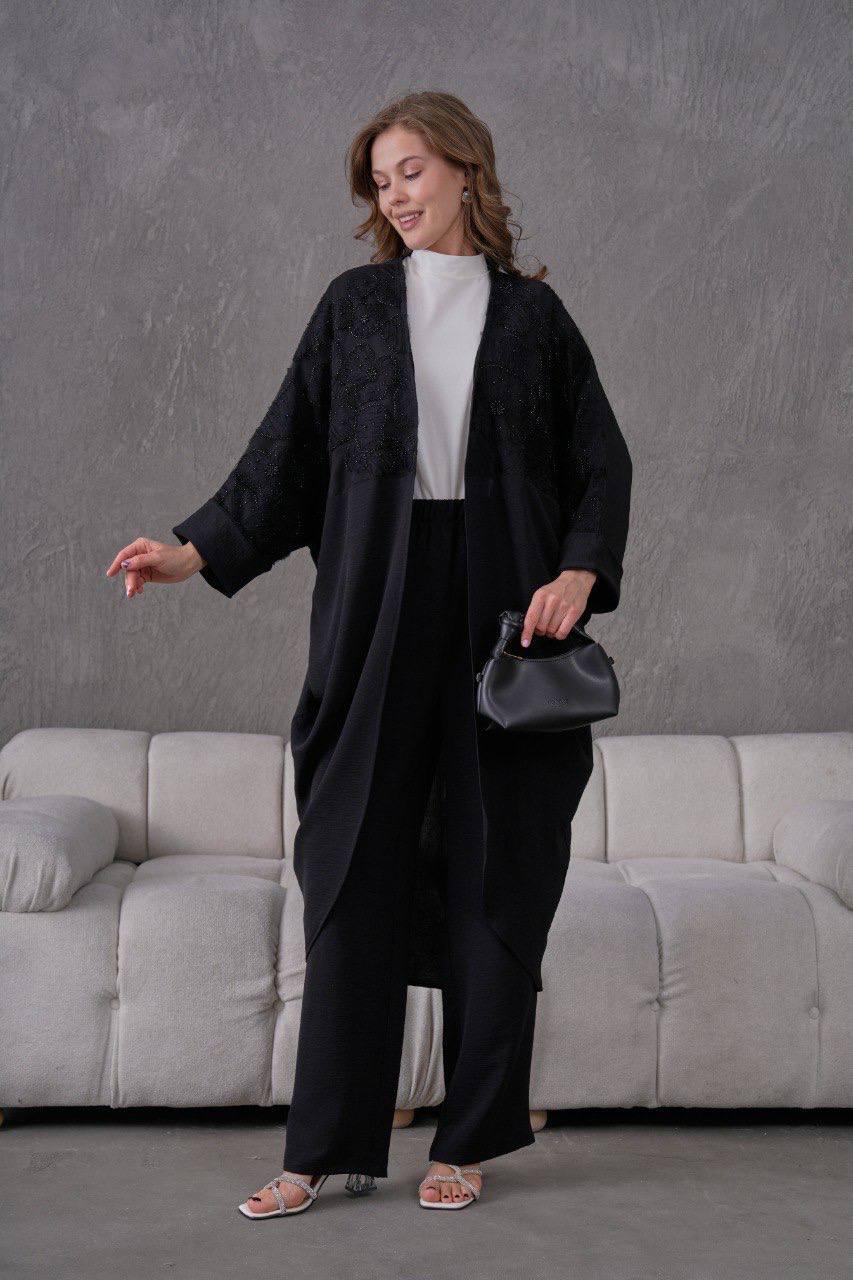 Zarif taş detayları ve yarım çiçek dokulu yüzeyiyle öne çıkan Siyah Keten Kimono, sade şıklığı modern bir duruşla buluşturuyor. Hafif ve nefes alabilen keten kumaşı sayesinde gün boyu konfor sunarken, dökümlü kimono formu vücuda yapışmadan şık bir siluet oluşturur. Günlük kombinlerden özel davetlere kadar geniş kullanım alanına sahip, zamansız ve kurtarıcı bir parçadır.