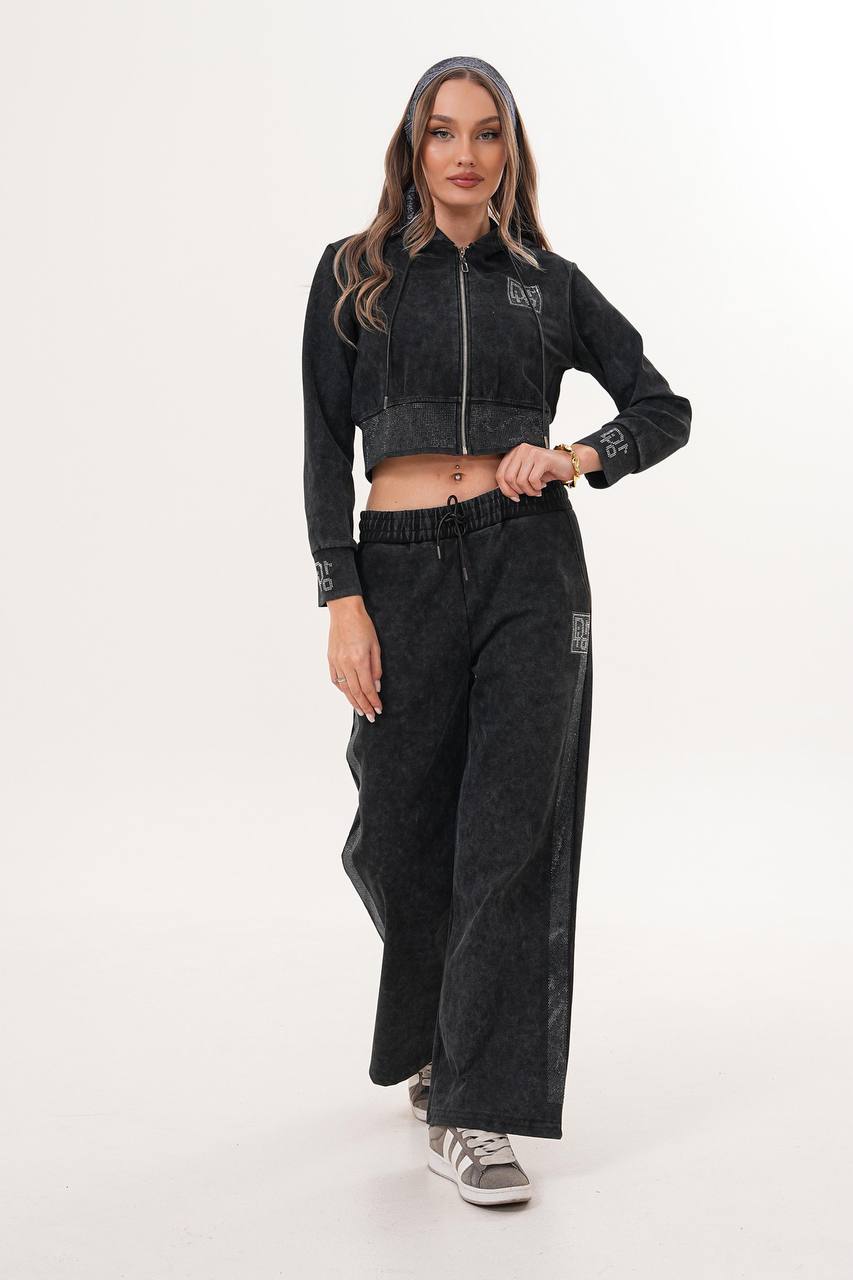 Modern yıkamalı dokusu ve crop kapüşonlu üst tasarımıyla öne çıkan bu eşofman takım spor şıklığı güçlü bir stil ile buluşturur
